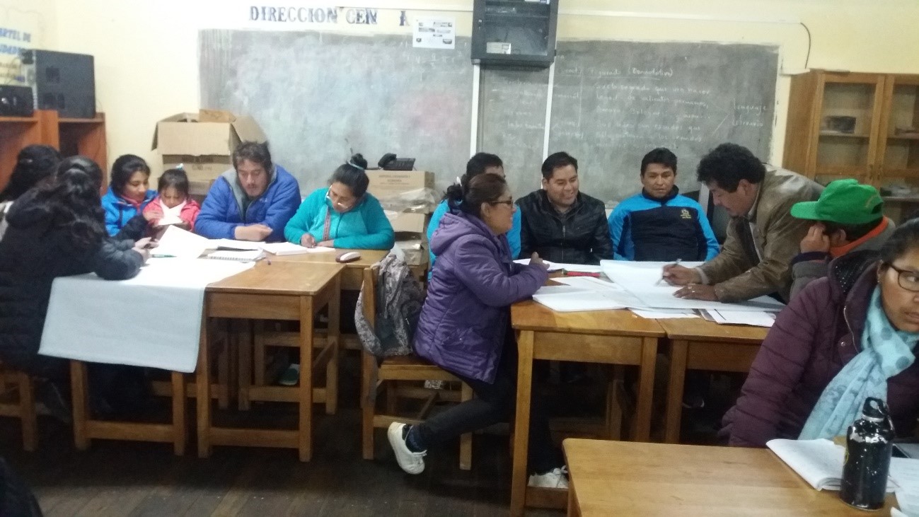 Acomayo: De onderwijsspecialisten van de UGEL krijgen uitleg over de totstandkoming van een schoolwerkplan.